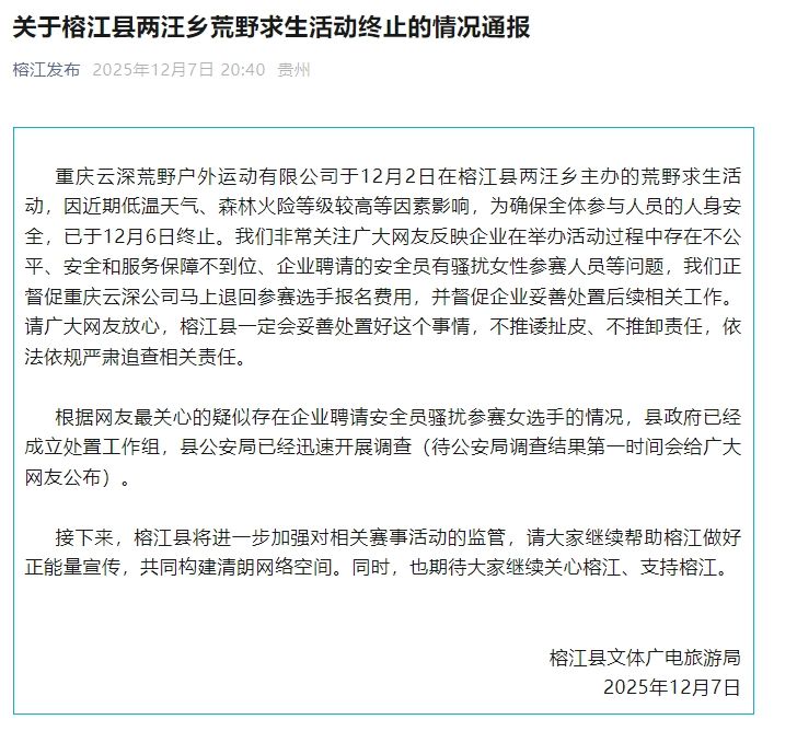 新京报12月7日消息,榕江县文化体育广电旅游局发布通报称:由重庆云深荒野户外运动有限公司主办的12月2日在榕江县梁王乡举办的荒野生存活动,因近期天气低温、山火高发等因素,于12月6日结束。为了确保所有参与者的人身安全,活动结束。我们对网友投诉的不公平现象、安全和服务保障不足、企业聘请的保安人员骚扰女选手等问题表示关注。我们敦促重庆云神公司立即退还大赛报名费,并督促该公司妥善处理后续相关工作。请榕江县妥善处理此事,不推诿、不推卸责任,并依法依规严肃追究相关责任。阿科针对网友最关心的公司聘请保安骚扰女选手的嫌疑,县政府成立了处理工作组,公安局迅速展开调查(公安局调查结果将于近期向网友公布)。接下来,榕江县将进一步加强对相关事件的监管。请继续帮助榕江弘扬正能量,共同构建清朗的网络空间。同时也希望大家继续关心和支持榕江。榕江县文化体育广电和旅游局编辑陈彦婷2025年12月7日